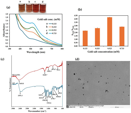 (a) UV–Vis absorption spectra of QT-AuNPs realized under different gold salt concentrations; the inset shows the phot images. (b) Plot of A520/A650 against gold salt concentrations. (c) FTIR of the QT-green line and QT-AuNPs-red line and (d) TEM image of QT-AuNPs produced under 0.523 mM gold salt concentration as the optimum condition.