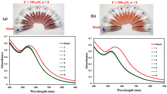 The precision of the QT-AuNPs/Al3+ probe towards F− detection was evaluated by charging F− at low and high concentration ranges from the calibration plot. Precision is oftentimes expressed as reproducibility and repeatability, using the relative standard deviation (RSD%). It connotes the ability of a detection system to be repeated without a significant deviation. For intra-day precision, F− at 150 and 500 µM was charged on the QT-AuNPs/Al3+ probe (n = 8) and compared with the blank, as shown in Figure 5. The absorption spectra experienced no significant changes for 150 and 500 µM F− concentrations (Figure 5a,b), while similar color images were obtained accordingly (Figure 5a,b, insets). The RSD (standard deviation/mean × 100) was acquired, and values of 1.7 and 2.2% were obtained for the tested concentrations. The tested concentrations of F− were also charged on the probe for three consecutive days to investigate the inter-day precision, where values of 2.1 and 2.7% were estimated for F− at 150 and 500 µM, respectively. These show that the QT-AuNPs/Al3+ is reliable for F− detection without notable response variability.