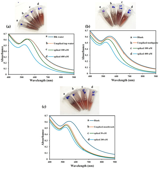 The practical demonstration of the detection probe towards F− detection in multiple real samples (tap water, toothpaste, and fluoride-rich mouthwash) was investigated using the standard addition method. The sample preparation steps have been detailed in the materials and methods section. Figure 6 shows the photo images and the absorption spectra of F− detection, revealing the QT-AuNPs/Al3+ probe or blank, the real sample without standard F− addition or unspiked sample, and the F− samples spiked with standard F− at two concentration ranges, or spiked samples. As can be seen, with the addition of a real sample to the QT-AuNPs/Al3+ probe, no color change was observed in the water sample compared to the blank (Figure 6a), only slight color change for toothpaste (Figure 6b), and significant color change for fluoride-rich mouthwash (Figure 6c). This shows the probe can respond to varying F− concentrations in diverse matrices. The analytical response (A520/A650) was obtained from the UV–Vis absorption spectra of each sample in triplicate and was converted to the concentration values using the appropriate calibration plots, as presented in Figure 3d,e. Accordingly, the % recoveries were estimated (using the formula in Section 2.5.1), and the F− concentrations in the different real samples are shown in Table 2. No F− was detected in tap water, while F− concentrations after the dilution factor for toothpaste and fluoride-rich mouthwash (5 and 20), respectively, were calculated as 356.5 ± 2.8 µM and 7955.6 ± 3.2 µM. That is, the obtained F− concentrations from the real samples were multiplied by the corresponding dilution factors. The recoveries for standard F−-spiked samples ranged between 96 and 102%, attesting to the high efficacy and accuracy of the probe towards F− detection.