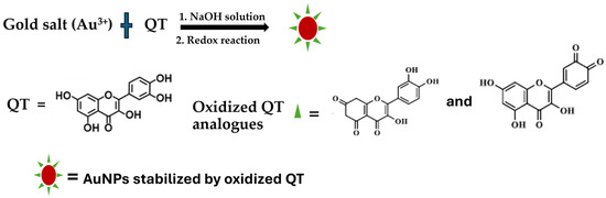 QT possesses multiple hydroxyl groups, which can act as a strong reductant towards gold salts (Au3+) as shown in Scheme 1. Under NaOH charging for pH adjustment, the multitudinous hydroxyl groups of QT can be deprotonated in solution, which increases its reductive efficiency and thus facilitates rapid nanoparticle nucleation, growth, and particle maturation processes [35]. Redox reaction between QT and gold salt results in the generation of colloidal AuNPs, stabilized by oxidized QT analog. As stated in Section 2.3, the starting materials mixing order includes QT, then NaOH for pH adjustment to 10, before gold salt addition. This created highly reproducible, fast, and well-formed AuNPs with a sparkling reddish color, showing an absorption maximum at 520 nm. The final pH of the synthesized QT-AuNPs is around 6.7.