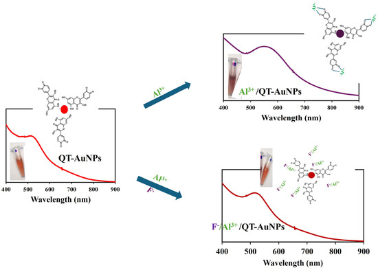 In this work, QT-AuNPs were synthesized at ambient conditions (room temperature-RT), and was applied for F− ion detection in aqueous environment. The QT-AuNPs is highly stable for over two months when kept in the refrigerator, showing reddish color with an absorption maximum at 520 nm. The addition of Al3+ could easily induce an aggregation effect on QT-AuNPs, which is marked by naked-eye observable color change and an absorption maximum red shift. This was proved to be attributed to the chelation effect of Al3+ on the free diketones on the QT structure serving as a stabilizing agent for QT-AuNPs. However, when our analyte F− was pre-mixed with Al3+, reversed color and absorption spectra transitions were easily observed and were deployed for F− detection. The detection probe QT-AuNPs/Al3+ shows impressive precision and selectivity, even in the presence of possible interferents at ten-fold higher concentrations of F−, and reliable real sample effectivity for F− profiling in tap water, toothpaste, and fluoride-rich mouthwash.