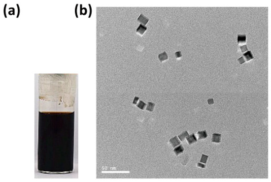 The Pd nanocubes were synthesized via the reduction of dihydrogen tetrachloropalladate (H2PdCl4) using sodium citrate as a reducing agent, with polyvinyl pyrrolidone (PVP) serving as a surfactant to stabilize the nanoparticle surfaces [29]. The resulting solution exhibited a brown–black color, as illustrated in Figure 1a. Transmission electron microscopy (TEM) images were obtained using an FEI Tecnai G2 F20 microscope operating at 200 kV (JEM-2010, JEOL, Tokyo, Japan), with a scale bar of 50 nm, as shown in Figure 1b. The average diameter of the Pd nanocubes was approximately 12 nm.