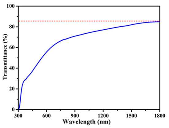 To examine the absorption characteristics at the Er3+ laser emission wavelength (1.56 μm), the absorption spectrum of the Pd nanocubes was measured using a film sample. This approach was chosen to avoid the strong absorption of liquid water typically observed between 1.4 and 1.8 μm. Figure 2 presents the absorption spectra of the Pd nanocube film, recorded with a UV-visible spectrophotometer (Agilent, Cary 5000, Santa Clara, CA, USA). The film exhibits broad absorption across a wide range, from 300 nm to 1800 nm, with a transmittance of approximately 80% at 1560 nm.