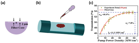 To obtain high-performance pulses, Pd nanocubes were combined with DFs to prepare the SA. Compared to film-based and microfiber SAs, DF-based SAs offer a higher damage threshold, enabling longer nonlinear interaction lengths. Additionally, DFs demonstrate excellent robustness and can be reused. The DF was manufactured using an ultraprecision side-polished method. With a 2 μm distance between the D-shaped surface and the fiber core (Figure 3a), a small amount of aqueous Pd nanocube solution was applied to the polished surface to form the SA (Figure 3b). To further assess its potential in mode-locked fiber lasers, the nonlinear absorption properties of the integrated modulator were examined. The transmission behavior of the SA was measured using pulsed lasers operating at 1.56 μm. As shown in Figure 3c, the transmission ratio varied with changes in peak power density. The data were fitted using an equation, α(I) = αs/(1 + I/Is)+ αns, from reference [31], where α(I) is the absorption coefficient and αs and αns are the saturable and non-saturable absorption parameters, respectively, clearly revealing the saturable absorption properties. The modulation depth αs and saturable intensity Is were determined to be 7.8% and 11.3 MW/cm2, respectively. These observations indicate that the Pd-DF SA presents the ability to generate an ultrafast pulse at 1.56 μm.