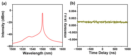 To further confirm the role of Pd nanocubes in enabling pulse generation, a bare DF was placed in the same all-fiber cavity. Despite adjustments in the PC and variations in the LD, no pulsed condition was obtained in the laser cavity. Figure 6 illustrates the spectral and temporal properties at 410 mW, clearly showing the absence of pulse generation when using a bare DF. This comparative result provides strong evidence that the mode-locked pulses were indeed modulated by the presence of Pd nanocubes.