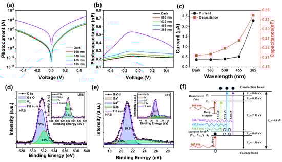 (a) Photocurrent and (b) photocapacitance of Pt/Ga2O3/Pt memcapacitor with different applied wavelength. (c) Trend in current and capacitance according to applied wavelength. XPS spectra of (d) O 1s and (e) Ga 3d in a Pt/Ga2O3/Pt memristor in a HRS. (f) Schematic of photoreaction mechanism of Ga2O3 bandgap [,]. Insets of (d,e) show O 1s and Ga 3d spectra in a Pt/Ga2O3/Pt memristor in LRS, respectively.