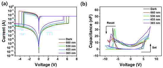 (a) I–V resistive switching and (b) C–V capacitive switching behaviors of Pt/Ga2O3/Pt optoelectronic synaptic device by applying the different exposure lights ranging from 365 nm to 660 nm.