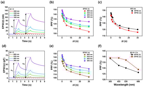Figure 4a,d show the photosynaptic time at two pulses of 1.0 s photoexcitation followed by 2.0 s darkness, plotted as excitatory postsynaptic current (EPSC(I)) and excitatory postsynaptic capacitance (EPSC(C)) as a function of wavelength. Paired-pulse facilitation (PPF), a measure of short-term plasticity in optoelectronic synaptic devices, quantifies the connection strength of a synapse by calculating the ratio of the second pulse (A2) to the first pulse (A1). This method confirmed short-term plasticity via red light excitation in the UV [,]. Both EPSC(I) and EPSC(C) exhibited higher optical excitation and slower decay at shorter wavelengths. Figure 4b,e display the PPFs for varying time intervals (Δt) from 0.1 s to 30 s as a function of wavelength in EPSC(I) and EPSC(C), respectively. PPF decreased with increasing Δt across the entire wavelength range, aligning with the time dependence of PPF in photosynaptic devices and biological synapses. For both EPSC(I) and EPSC(C), PPF values increased with shorter excitation wavelengths. Specifically, as the wavelength decreased from 660 nm to 365 nm, PPF increased from 111% to 126% for EPSC(I) and from 114% to 128% for EPSC(C) at Δt = 20 s. This indicates enhanced short-term plasticity at shorter wavelengths, suggesting improvements in both short- and long-term memory characteristics. Figure 4c compares the PPF values of EPSC(I) and EPSC(C) at a wavelength of 455 nm, confirming that EPSC(C) exhibited a higher PPF value than EPSC(I) across all Δt. In addition, Figure 4f demonstrates that EPSC(C) exhibits a higher PPF value than EPSC(I) across all wavelength bands at Δt = 2.0 s. This indicates that EPSC(C) has better short-term plasticity compared to EPSC(I) across all wavelengths. The difference in PPF values is attributed to the decay mechanisms following LED stimulation in the Ga2O3 thin film. When light is applied to Pt/Ga2O3/Pt structure, photons excite electrons in the conduction and acceptor levels, forming electron–hole pairs and generating a photocurrent. Once the external stimulus is removed, the generated free carriers recombine, leading to a reduction of photocurrent. For capacitance, the generation of electron–hole pairs increases the movable effective charge density within the Ga2O3 film. Additionally, electrons trapped at the interface are released by the external stimulus, which increases the total charge. The relationship, C = Q/V (Q is charge and V is voltage), indicates that capacitance increases with accumulated charge. After the external stimulus is removed, the released carriers are re-trapped by defects, leading to a decrease in capacitance due to the reduction in additional carriers. The higher PPF value of EPSC(C) compared to EPSC(I) is due to the distinct behaviors of charge carriers. Rapid recombination in EPSC(I) leads to a swift decline, as it is sensitive to immediate carrier availability. In contrast, capacitance can store charge more effectively, with some carriers becoming trapped in defect states []. This prevents immediate recombination and results in a slower decay of capacitance, allowing it to maintain higher levels over time. Thus, capacitance demonstrates a more robust long-term memory effect, enhancing its overall characteristics.