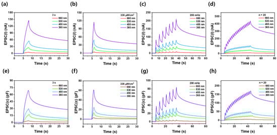 Synaptic characteristics of (a–d) EPSCs(I) and (e–h) EPSCs(C) under varying conditions: (a,e) 3.0 s exposure duration, (b,f) light power intensity of 336 µW/cm2, (c,g) light input frequency of 200 mHz, and (d,h) 20 exposure cycles at different wavelengths.
