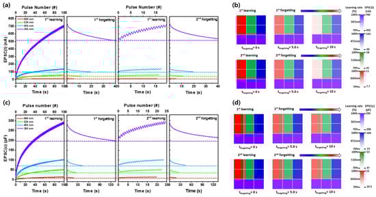 Learning and forgetting experience behaviors under pulsed light stimulation (0.5 s pulse width and 50% duty cycle) measured by (a) EPSC(I) and (c) EPSC(C). Mimicking human visual memory processes through the learning and forgetting experience based on (b) EPSC(I) and (d) EPSC(C).