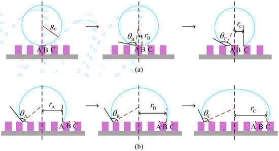 The pillared surface can be idealized as a repeating unit consisting of pillar spacing and width. Consequently, the system’s states at locations A, B, and C (Figure 2b) represent a typical scenario where the contact line moves continually through a series of pillar widths and spacings. Following the previous analysis, as a drop advances from A to B, the changes in free energy and the volume of the drop can be calculated using Equations (7) and (8):