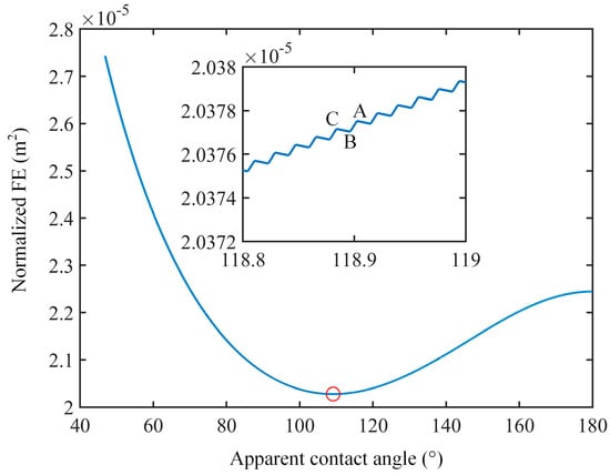 To elucidate the equilibrium state and equilibrium contact angle of the system, Figure 4 presents the calculations of the free energy change for the Wenzel state as a function of the apparent contact angle. The surface with the dimensions a = 100 nm, b = 200 nm, and h = 200 nm is employed. As the contact line moves, the apparent contact angle gradually decreases from 180°, accompanied by significant changes in the system’s free energy. The minimum value of free energy on a global scale (indicated by empty circles) and multiple local free energy minima can be observed on the free energy curve for the Wenzel state, which determine the location of the contact line. As the contact line continues to advance through position A, B, and C (Figure 2b), a fluctuation is observed on free energy curves, indicating that the free energy evolves through a series of local free energy minima because of the different locations of the contact line. The contact line should be at position B, where the nanopillars are fully covered by the drop when the drop stops moving, because other positions, such as A or C, are not thermodynamically favored due to local free energy maxima, as shown in the enlarged drawing in Figure 4. Generally, the global free energy minimum corresponds to the equilibrium state, and the apparent contact angle at this state is defined as the equilibrium contact angle [37]. Consequently, the equilibrium contact angle is 109.1°, as indicated by the empty circles in Figure 4.