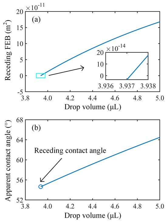 The sessile drop method reveals that contact angle hysteresis quantification is achievable through gradually varying the volume of the drop [12,33,34]. Consequently, this study employs an analysis of the free energy barrier variations during changes in drop volume to theoretically calculate the contact angle hysteresis. As the drop volume slowly decreases, both the constant contact radius mode and the constant contact angle mode can be experimentally observed [35]. When a receding drop loses a volume ΔV through the constant contact radius mode, the drop volume is altered to