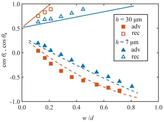 Figure 7. Predicted (lines) and measured (symbols) receding and advancing contact angles for pillared surfaces with different pillar heights (h = 7 µm, 30 µm) against the ratio of the pillar width w to the pitch d. The experimental values have been reported by Forsberg et al. [28].