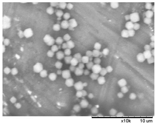 r-ZnHCF was synthesized with a co-precipitation method found in the literature [20]. ZnSO4 H2O (2 mmol) was dissolved in 200 mL of ultrapure water, and K3Fe(CN)6 (2 mmol) was dissolved in 200 mL of ultrapure water. Then, the two solutions were mixed very quickly under vigorous stirring; the addition time was carefully controlled to obtain the correct shape of the particles, i.e., cuboctahedron-shaped ZnHCF. Then, the mixture was left under stirring for 24 h and then allowed to rest for 12 h. The resulting powder was filtered, washed with ultrapure water, and dried at room temperature. Then, the powder was heated at 70 °C to remove the coordinated water and transform the cubic phase into a rhombohedral structure. The obtained solid was characterized by SEM (Figure 1).