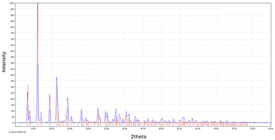 XRD diffractogram of synthetized s-ZnHC (blue line) and its theoretical pattern (red lines).