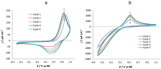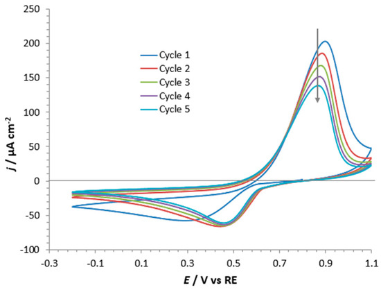 CV (five cycles) of s-ZnHCF@FTO powder in 0.1 M Gd(CH3COO)3 at 50 mV·s−1. The arrows indicate the decrease of peak current by increasing the number of cycles.