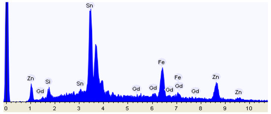 Figure 11 displays the EDX spectrum after 20 min of incorporation potential (Figure 10a). As expected, the detected elements included Zn and Fe from ZnHCF and Sn from FTO. Traces of Si were also observed in the sample. Finally, Gd was detected by EDX, thus demonstrating that gadolinium was successfully incorporated into the structure of ZnHCF matrix.