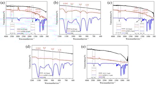 FTIR spectra: (a) full spectra of Al/PDF (29 μm); (b) 1200~600 cm−1 of Al/PDF (29 μm); (c) full spectra of Al/PDF (13 μm); (d) 1200~600 cm−1 of Al/PDF (13 μm); (e) full spectra of Al/PDF (1~3 μm).