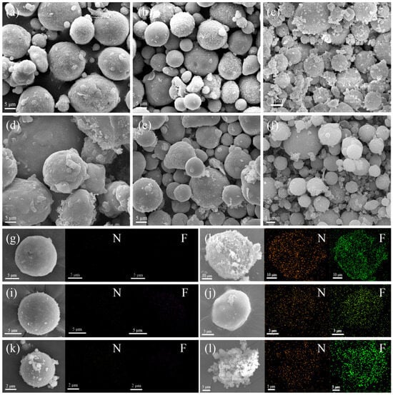 FESEM images: (a) Al (29 μm); (b) Al (13 μm); (c) Al (1~3 μm); (d) Al/PDF (29 μm); (e) Al/PDF (13 μm); (f) Al/PDF (1~3 μm), and mapping images: (g) Al (29 μm); (h) Al/PDF (29 μm); (i) Al (13 μm); (j) Al/PDF (13 μm); (k) Al (1~3 μm); (l) Al/PDF (1~3 μm).