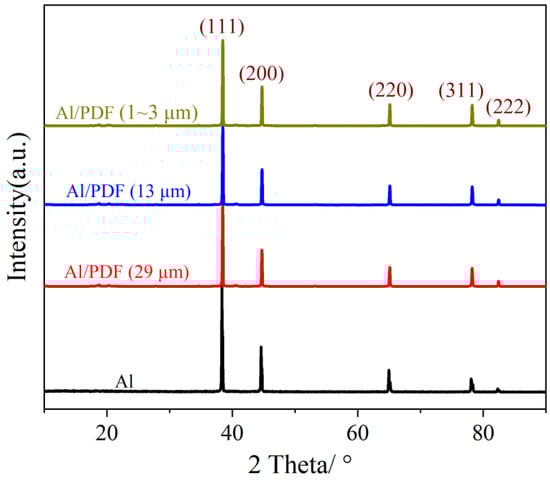 Figure 4 depicts the XRD diffraction pattern of Al/PDF with different powder sizes. It was observed from Figure 4 that there was no significant change in the strong peak position of Al/PDF composites in comparison to the XRD standard spectra of Al powder. Besides, the angles of the five diffraction peaks in the three Al/PDF composites were maintained at 38.46°, 44.73°, 65.09°, 78.26°, and 82.45°. This finding aligned with the diffraction peaks of standard Al, and the corresponding diffraction crystal planes were (111), (200), (220), (311), and (222), respectively [,,]. Notably, the crystal structure was a face-centered cubic structure, suggesting that the positions of the diffraction peaks were unchanged after adding PDF for Al powder.