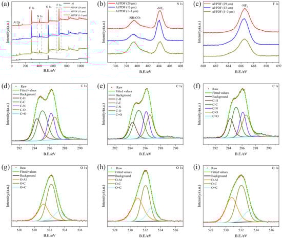 XPS wide scan and high-resolution scan spectra of Al/PDF composites: (a) full scan; (b) N 1s spectra; (c) F 1s spectra; (d,g) C 1s and O 1s spectra of Al/PDF (29 μm); (e,h) C 1s and O 1s spectra of Al/PDF (13 μm); (f,i) C 1s and O 1s spectra of Al/PDF (1~3 μm).