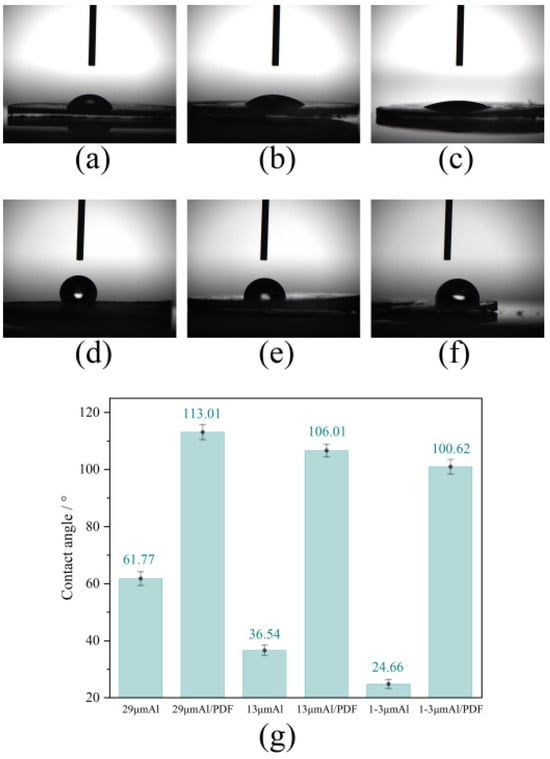 Photographs of static water contact angle measurement: (a) Al (29 μm); (b) Al/PDF (29 μm); (c) Al (13 μm); (d) Al/PDF (13 μm); (e) Al (1~3 μm); (f) Al/PDF (1~3 μm); and (g) static water contact angle.