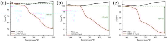 TG analysis of Al/PDF: (a) 29 μm; (b) 13 μm; (c) 1~3 μm.