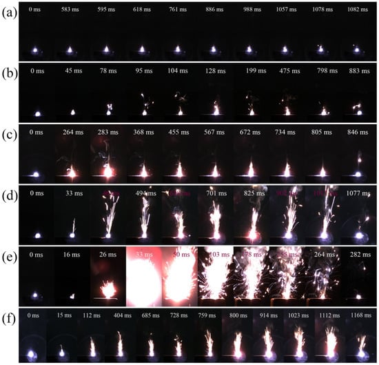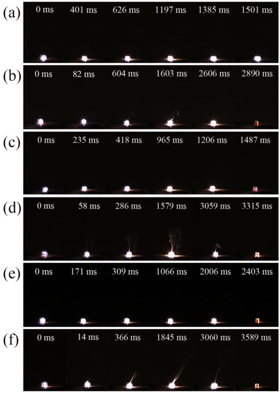Combustion images after ignition: (a) Al (29 μm); (b) Al/PDF (29 μm); (c) Al (13 μm); (d) Al/PDF (13 μm); (e) Al (1~3 μm); (f) Al/PDF (1~3 μm).