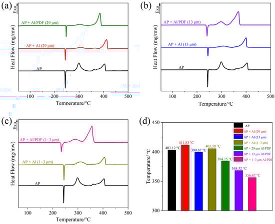 DSC curves of AP decomposition: (a) Al and Al/PDF with 29 μm; (b) Al and Al/PDF with 13 μm; (c) Al and Al/PDF with 1~3 μm, and (d) histogram of the corresponding THTD.