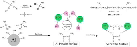 Aluminium (Al) powders with sizes of approximately 29 μm, 13 μm, and 1~3 μm were acquired from the Shanghai Academy of Spaceflight Technology (Shanghai, China). 95% ethanol, ethyl acetate, and hexane, all of analytical purity, were brought from Wohua Chemical Co., Ltd. (Shanghai, China). Sodium hydroxide (NaOH) and (3-aminopropyl) triethoxysilane (KH-550), all of the analytical grades, were provided by Sinopharm Chemical Reagent Co., Ltd., (Shanghai, China). Analytically-pure methylidynetri-p-phenylene tri-isocyanate (20% in C6H5Cl) was purchased from Macklin (Shanghai, China). Ammonium perchlorate (AP) with a particle size of approximately 150 μm was purchased by the Xi’an Modern Chemistry Research Institute. PDF was synthesized using Li’s et al. [] method. The molecular mass (Mn) of PDF was 3600 g/mol, with a polydispersity index (Mw/Mn) of 1.6.