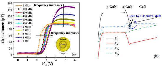 Capacitance–voltage (C-V) tests were conducted on the p-GaN stack capacitors across various frequencies by using an Agilent B1505A semiconductor analyzer. Systematic errors and Random errors were mitigated by calibration and by performing multiple measurements at different times and averaging the results. Figure 2a displays the C-V results across a frequency range of 1 kHz to 5 MHz. Notably, as the test frequency (fm) increases, a positive shift in the threshold voltage is observed. This phenomenon appears because increased gate voltage (VG) elevates the Fermi level above the trap level, resulting in electron capture inevitably, and consequently delays accumulation, as shown in Figure 2b. Furthermore, at higher fm, an increased number of traps at the AlGaN/GaN interface become unable to respond to rapid voltage variations, thereby further depleting channel electrons and exacerbating the C-V curve shift.