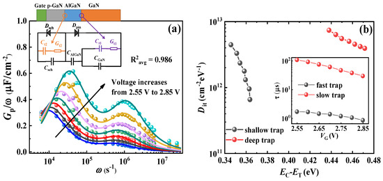 (a) Gp/w is a function of w at selected voltages; the inset in (a) shows the schematic of the p-GaN gate stack and the equivalent circuit model. (b) Dit is a function of EC-ET and τt is a function of VG.