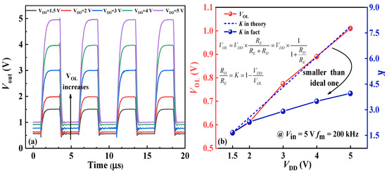 (a) Output voltage Vout waveforms diagram under different VDD. (b) Low-level voltage (VOL) and K value under different VDD.