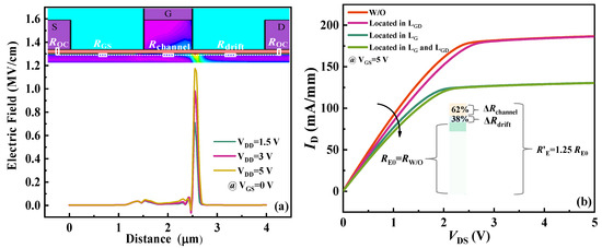 In Figure 7a, simulations illustrate that the electric field at the switching transistor’s gate/drain edge intensifies with increasing VDD, promoting electron trapping. This phenomenon results in a positive shift in threshold voltage, elevated on-resistance, and an increase in VOL. Figure 7b further simulates the impact of trapping on the switching transistor’s on-resistance at different interface regions, specifically the drain access region LGD and the gate region LG. In the absence of traps, the switching transistor’s on-resistance can be represented as a series of contact resistance ROC, source-channel resistance RGS, drift-region resistance Rdrift, and channel resistance Rchannel, collectively denoted as RE0 or RW/O. When traps are present at LGD or LG, they incrementally add ΔRdrift or ΔRchannel to the total on-resistance. The results demonstrate that trapping in the gate region is a primary contributor, accounting for 62% of the total on-resistance degradation, whereas trapping in the drain access region contributes 38% and has minimal effect on the saturated drain current.