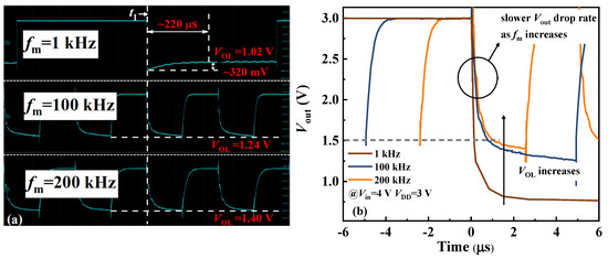 In the experiment, the Tektronix AFG31000 arbitrary function generator (Shanghai, China) was used to offer the input voltage Vin with the supply voltage offered by the DC power source, and observed the output voltage Vout waveform through the Tektronix MSO54B oscilloscope (Shanghai, China). Figure 6a displays the output voltage (Vout) waveforms of the inverter across various VDD values at an operating frequency of 200 kHz, with Vin set at 5 V to fully activate the switching transistor and stabilize VOL. As VDD rises from 1.5 V to 5 V, the inverter consistently achieves a high-level voltage VOH = VDD. However, VOL varies across VDD values, contrary to typical reports of VOL stability [11,12]. Instead, as VDD increases, VOL rises from 0.56 V to 1.01 V, growing by 80%.