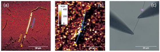 The initial phase of the experiment focused on preparing a model electrical microcircuit designed to simulate an operating electronic microdevice. First, a small volume (20 µL) of low-concentration colloidal NWs were spin-coated at 5000 rpm for 60 s onto a glass microscope cover slip. The resulting surface density of the nanowires was approximately one nanowire per 100 µm2. The main component of the microcircuit was a carefully selected single NW, about 50 µm in length, imaged using backscattered laser light, as shown in Figure 4a. The high quality of this nanowire was verified experimentally by monitoring the propagation length of laser-launched surface plasmon polaritons [31]. In the subsequent step, the sample was coated with a layer of luminescent nanoprobes—temperature indicators. To achieve this, 20 µL of nanocrystals suspended in chloroform were spin-coated at 2500 rpm for 30 s onto a NW-containing substrate. This process produced a relatively high surface density of nanocrystals—approximately 20 NCs per 100 µm2, as observed in photoluminescence imaging (Figure 4b). Such a relatively high surface density of luminescent probes was essential for mapping temperature around the circuit. At the end of this process, electrical probes were connected to the NW. The probes were positioned near the NW and gradually lowered while monitoring the contact moment using real-time microscope preview and by measuring the circuit resistance. For nanowires with a length of 20 µm, the circuit resistance was approximately 5–10 Ω, which was sufficient to achieve resistive heating. The positions of the probes—coupled to the left end and the middle of the NW—defined the heating section (approximately 20 µm long) and the radiator (around 30 µm long). A selected nanowire connected to the electrical probes is shown in Figure 4c.