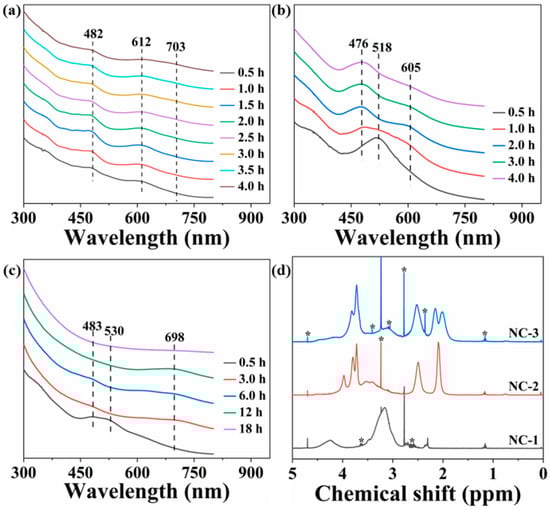 UV-Vis absorption spectra of Ag NC-1 (a), Ag NC-2 (b), and Ag NC-3 (c) at different reaction times. 1H-NMR spectra of the prepared Ag NCs (d). The peaks marked with an asterisk correspond to the solvent signals.