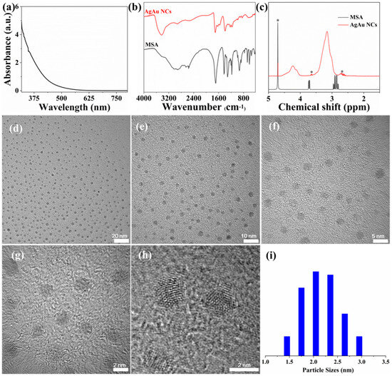 (a) UV-Vis absorption spectrum of AgAu alloy nanoclusters. (b) Infrared absorption spectra and (c) 1H NMR spectra of AgAu alloy nanoclusters and mercaptosuccinic acid. The peaks marked with an asterisk correspond to the solvent signals. (d–i) TEM pictures and statistical analysis of the sizes of AgAu alloy nanoclusters.
