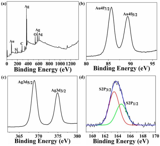 (a) XPS survey spectrum of AgAu alloy nanoclusters. (b–d) The high-resolution spectra analysis of gold, silver, and sulfur elements in AgAu alloy nanoclusters.