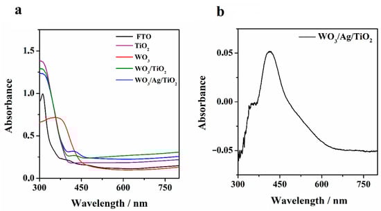 (a) Absorbance spectra of FTO substrates: bare (black), with a TiO2 layer (violet), with a WO3 layer (red), with a TiO2 and WO3 bilayer (green), and with Ag nanoparticles placed between the WO3 and TiO2 layers. (b) Relative absorbance spectra of the Ag-enhanced photoanode related to the reference FTO/WO3/TiO2 sample.