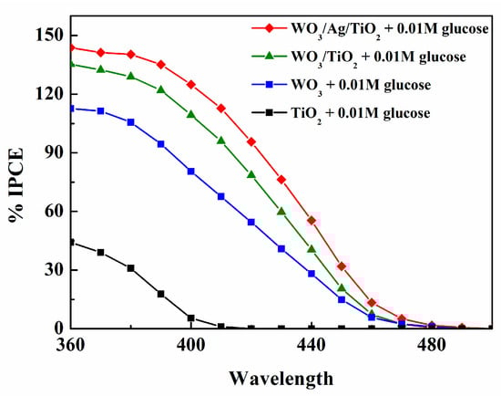 IPCE spectra for WO3, TiO2, WO3/Ag/TiO2, and WO3/TiO2 photoanodes measured at 0.6 V vs. Ag/AgCl in a 0.01 M NaCl/Na2SO4 electrolyte of pH 7 containing 0.01 M glucose.