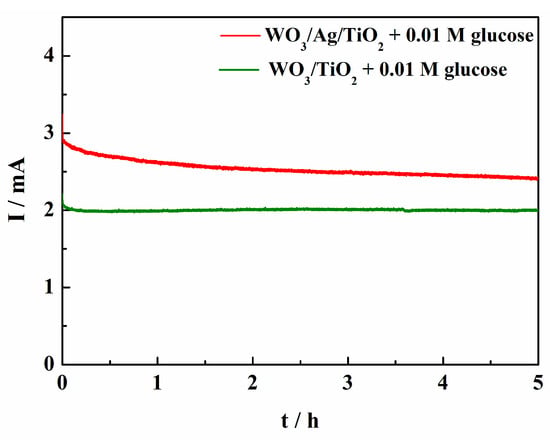 The photo-currents of glucose oxidation measured during 5 h long electrolysis conducted at 0.6 V vs. Ag/AgCl in a 0.01 M NaCl/Na2SO4 electrolyte of pH 7, using WO3/Ag/TiO2 and WO3/TiO2 photoanodes irradiated with simulated AM 1.5 G solar light.