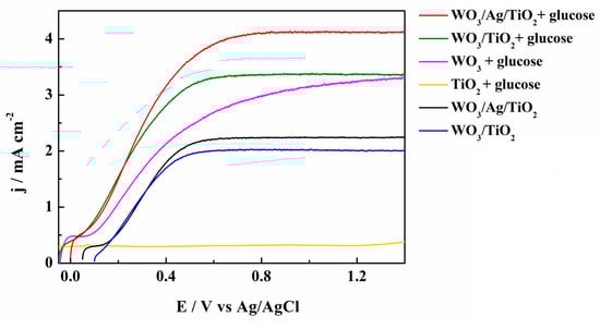 Photocurrent densities vs. imposed potential (j-E) plots in a 0.01 M NaCl/Na2SO4 electrolyte of pH 7 containing 0.01 M glucose using WO3, TiO2, WO3/TiO2 and WO3/Ag/TiO2 recorded under simulated AM 1.5G irradiation.