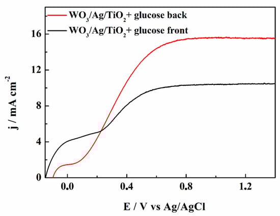 In Figure 5, we present photocurrent-potential (j-E) plots for the WO3/TiO2 and WO3/Ag/TiO2 photoanodes in a 0.01 M NaCl/Na2SO4 electrolyte of pH 7. Under simulated solar AM 1.5G (100 mW cm−2) irradiation, both photoanodes reached the plateau of ca. 2.2 mA cm−2. A table reporting a comparison of our results with the papers cited in the present article is presented in Table S1. The addition of 0.01 mol L−1 of glucose to the supporting electrolyte led to very large increases in both photocurrents, with a larger value of ca. 4.1 mA cm−2 obtained for the WO3/Ag/TiO2. This measured value is much higher than the photocurrent obtained for WO3/TiO2, as well as those for bare WO3 and TiO2 photoanodes. An interesting result was also provided by measurements performed for the WO3/Ag/TiO2 photoanode in a 0.01 M NaCl/Na2SO4 electrolyte of pH 7 with 0.01 mol L−1 of glucose under 3 sun illumination (Figure 6), where an impressive increase in the photocurrent, during the backside illumination, up to ca. 16 mA cm2 was observed. As mentioned above, this is clearly related to the light reflection by the quasi-continuous layer of silver nanoparticles and by the TiO2 overlayer.