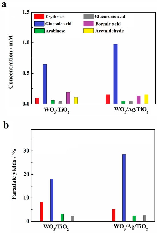 The IPCEs largely exceeding 100% shown in Figure 3 require an additional comment regarding the mechanism of glucose photo-oxidation. As in the case of numerous other organic compounds [], glucose photo-oxidation involves so-called photocurrent doubling []. This means that the initial step of the reaction, involving the transfer of the positive hole generated in the valence band of WO3 to the adsorbed molecule of glucose, is followed by the injection, carried out by the formed radical species, of an electron to the conduction band of WO3. This corresponds well to the formation of gluconic acid—a two-electron oxidation product. Gluconic acid was by far the most prominent glucose photo-oxidation product obtained after the 5 h long electrolysis, as shown in Figure 4, with much higher Faradaic yields obtained for the WO3/Ag/TiO2 photoanode (cf. Figure 7b). The presence of significant amounts of arabinose and erythrose in the analyzed post-electrolysis solution suggests that the main glucose photo-reforming pathway was pathway (A) represented in the proposed reaction mechanism shown in Figure 8. We note that the formation of arabinose and erythrose, involving an exchange of two additional electrons, is accompanied by the elimination of formic acid.