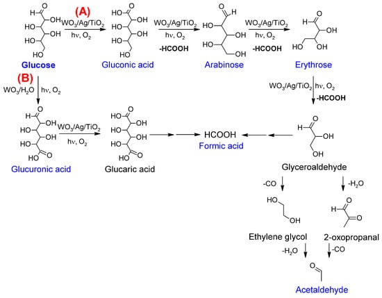 The proposed reaction pathway of glucose reforming over the WO3/Ag/TiO2 photoanode; products quantified in this work are shown in blue. (A) main pathway; (B) parallel pathway.