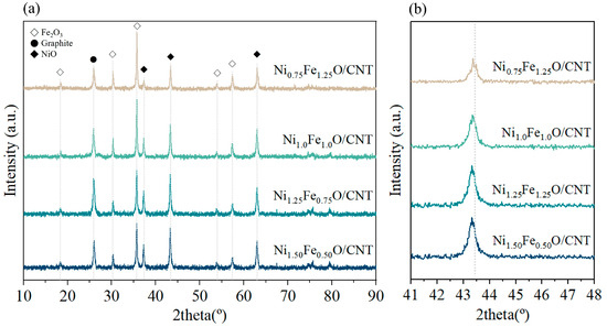 Figure 1 shows the XRD patterns of the catalysts; the spectra of all catalysts showed a peak at 2θ = 26.2°, which corresponds to the lattice plane (0 0 2) and is ascribed to graphite 2H (ICSD No. 98-005-3781). For all the catalysts in Figure 1, iron oxide (ICSD No. 96-100-8726) peaks were identified along with nickel oxide (ICSD No. 98-005-3781) peaks. This implies that CNTs were formed by graphitization induced by Fe-Ni oxide catalysts [18,28]. The intensity of the graphite (0 0 2) plane for Ni1.25Fe0.75O/CNT was confirmed to be the highest, representing a high yield of CNT by Ni-Fe oxide catalysts [29]. As shown in Figure 1b, the peak corresponding to the NiO (2 2 2) plane was shifted according to the content of iron, with the lowest angle shifted at Ni1.25Fe0.75O/CNT, indicating that the interplanar distance was narrowed. The peak shift implies the lattice expansion of NiO due to atomic radius difference, formation of oxygen species, and oxygen vacancies due to the change in the valence state of metal ions [30]. Since the atomic radii of Fe3+ and Ni2+ are the same at 0.069 nm, the lattice expansion of the NiO (2 2 2) plane can be caused by the repulsive force due to the formation of oxygen species or oxygen vacancies [31,32]. The average grain sizes of NiO were estimated to be 24 nm, 19 nm, 12 nm, and 21 nm for Ni0.75Fe1.25O/CNT, Ni1.0Fe1.0O/CNT, Ni1.25Fe0.75O/CNT, and Ni1.50Fe0.50O/CNT, respectively, using the Scherrer formula to consider the full width at half maximum (FWHM) of the peaks of NiO.