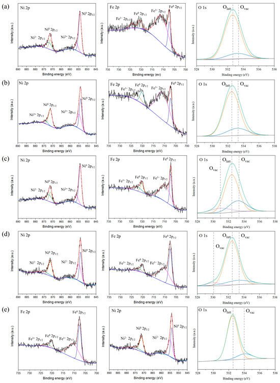 Table 1 shows the surface atom concentration and XPS fitting results of the catalysts, and Figure 5 shows the Ni 2p, Fe 2p, and O 1s spectra for each catalyst and the binding energy according to the Ni ratio. The Ni 2p spectrum is divided into Ni 2p3/2 and Ni 2p1/2. The peaks at 852.9 eV and 869.3 eV were assigned to Ni0 2p3/2 and Ni0 2p1/2, and these correspond to the metallic state of nickel, and the peaks at 854.7 eV and 872 eV were attributed to Ni2+ 2p3/2 and Ni2+ 2p1/2 [44]. The two peaks at 710.8 eV and 724.0 eV were ascribed to the binding energy of Fe3+ 2p3/2 and Fe3+ 2p1/2, respectively, and the two peaks at 706.8 eV and 720.1 eV in the Fe 2p spectrum were attributed to the zero-valence state Fe [45].
