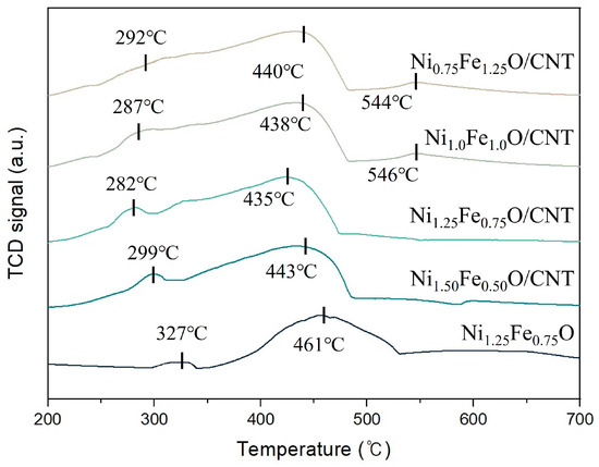 H2-TPR analysis was performed to estimate the redox properties of the catalysts, and the resulting H2-TPR profiles of Ni-Fe oxide/CNT are shown in Figure 6. The catalysts showed different reduction processes based on the weight ratio of Ni. A weak reduction peak was identified at about 300 °C, and a broad peak was observed at about 440 °C for all catalysts, which corresponded to the reduction processes Fe2O3→Fe3O4→FeO and Ni2+→Ni0 [51]. In 0.75NiO/CNT and 1.0NiO/CNT, weak peaks were observed at about 550 °C, which corresponded to the reduction process FeO→Fe [51]. The reduction peaks of Ni-Fe oxide molecules embedded in CNTs were shifted to a lower temperature compared to Ni1.25Fe0.75O, and the peaks of Ni1.25Fe0.75O/CNT were also shifted to a lower temperature. The metal oxide supported on CNTs was easily reduced, and the oxygen in catalysts was more active, which reveals that the unique electronic properties of CNTs could promote charge transfer between metal atoms and CNTs, leading to enhancement in its redox potential [51]. The reduction peak was not observed at about 550 °C in Ni1.25Fe0.75O/CNT and Ni1.50Fe0.50O/CNT. Fe species are more difficult to reduce than the Ni species, and the reduction of the metal oxide catalyst was affected by the interaction between catalyst and supporter [52,53,54]. The interaction between catalyst and supporter weakened by decreasing the yield of CNTs as the content of Fe was increased. This made it difficult to reduce the catalyst. The total H2 consumption by Ni0.75Fe1.25O/CNT, Ni1.0Fe1.0O/CNT, Ni1.25Fe0.75O/CNT, Ni1.50Fe0.50O/CNT, and Ni1.25Fe0.75O were calculated to be 1.712 mmol/g, 2.374 mmol/g, 2.764 mmol/g, 1.856 mmol/g, and 1.349 mmol/g, respectively, as a result of integrating the H2 consumption. The highest H2 consumption by Ni1.25Fe0.75O/CNT was attributed to the enhanced redox property, which was due to the increased number of active sites on the catalyst surface due to the promoted charge transfer between the CNTs and Ni-Fe oxide nanoparticles [55].